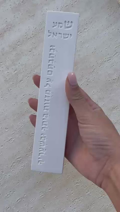בית מזוזה בטון לבן עשוי בטון פולימרי טבעי עם כיתוב טיפוגרפי מעוצב שמע ישראל. מתאימה לקלף 15.